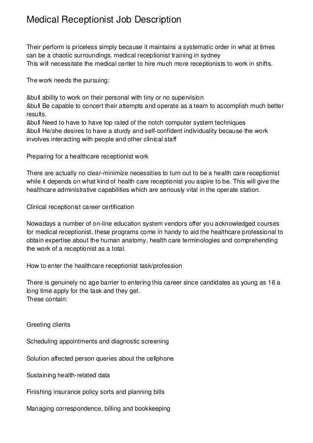 Office Receptionist Job Description Template. See job-winning receptionist resume samples for all types of jobs: from medical, to front Not "only" a receptionist? See one of our other guides Use the Right Receptionist Resume Template.