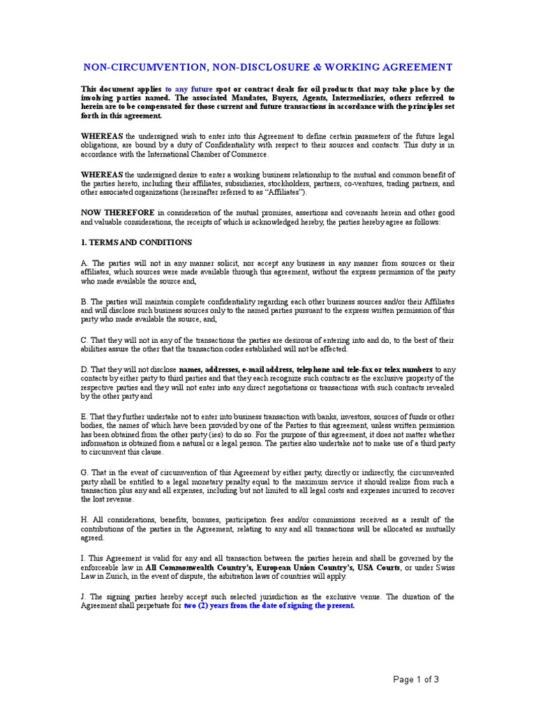Non Circumvention Non Disclosure Working Agreement Sample. Business organizations working with a secret formula expect their employees to keep this a secret and not disclose it to others. Mutual Non-Disclosure and Non-Circumvention Agreement Form. catskillcitizens.org.