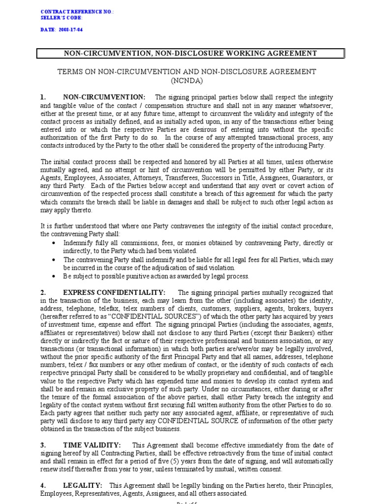 A sample of Non-Circumvention, Non-Disclosure & Working Agreement (NCNDA).