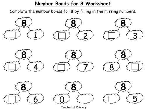 Number Bond Worksheets To 8. Each worksheet is randomly generated and thus unique. Number Bonds Worksheets - Horizontal Format These Number Bonds Worksheets are great for testing children in their ability to solve number bonds problems for a given sum.