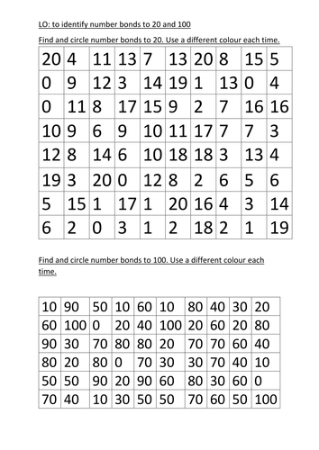 Work sheets: Number Bonds to 10, 20 and 100 | Teaching ...