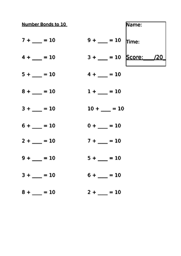 Number Bonds to 10 and 20 test sheet | Teaching Resources