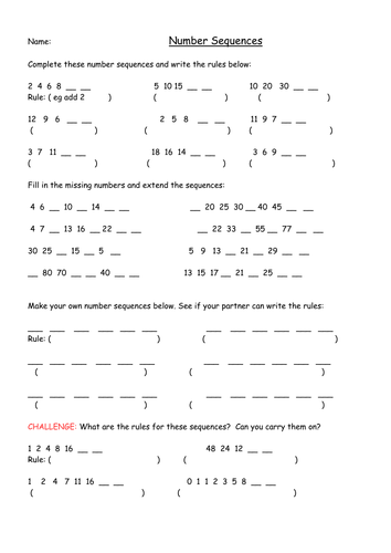 Useful as an introduction to number patterns, this worksheet encourages children to predict missing numbers in the sequences. This skill helps us to transition to working with functions and creating our own. This section contains a collection of worksheets to help children develop skills relating to sequences and patterns.